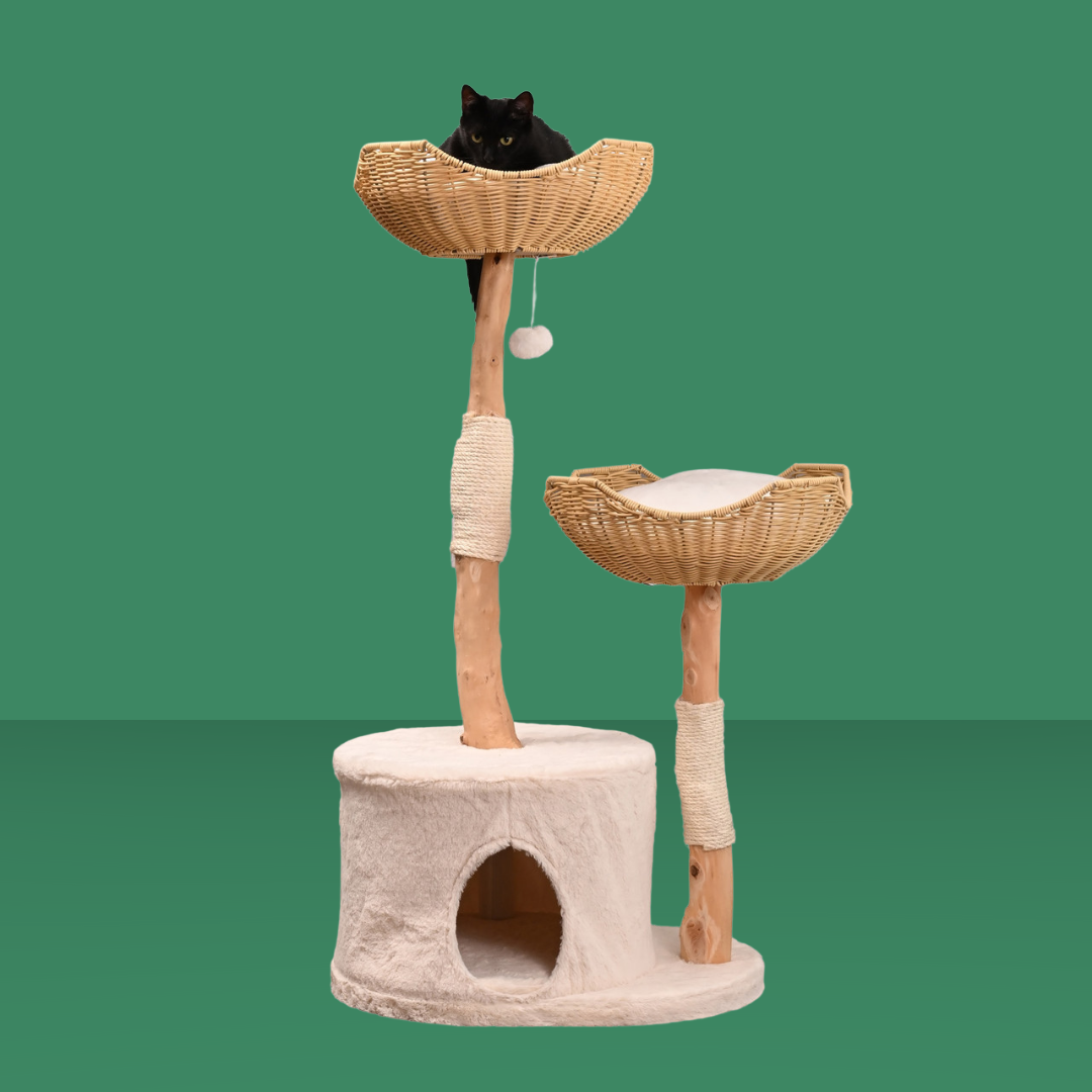 Give your cats the best place to play and rest! This elegant, natural cat tree is made with sturdy tree branches, wrapped with sisal to encourage your cat to stretch and scratch. The base is made to handle any cannonball kittens, sturdy and wobble-resistant. Cozy baskets give your cats the best places to snooze and snuggle, but toys hanging give them something a little extra to play with when it's time to romp! This cat tree offers everything your kitties need whether they want to lounge in one of the little baskets, climb, or scratch.